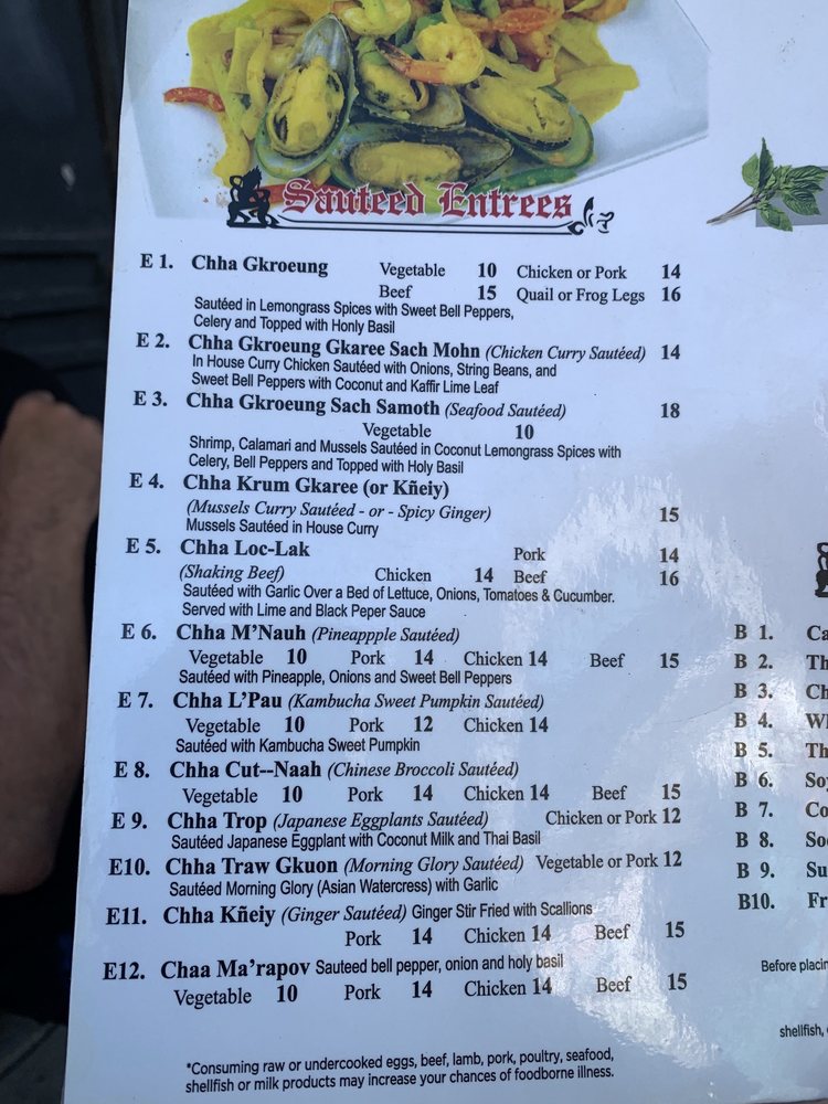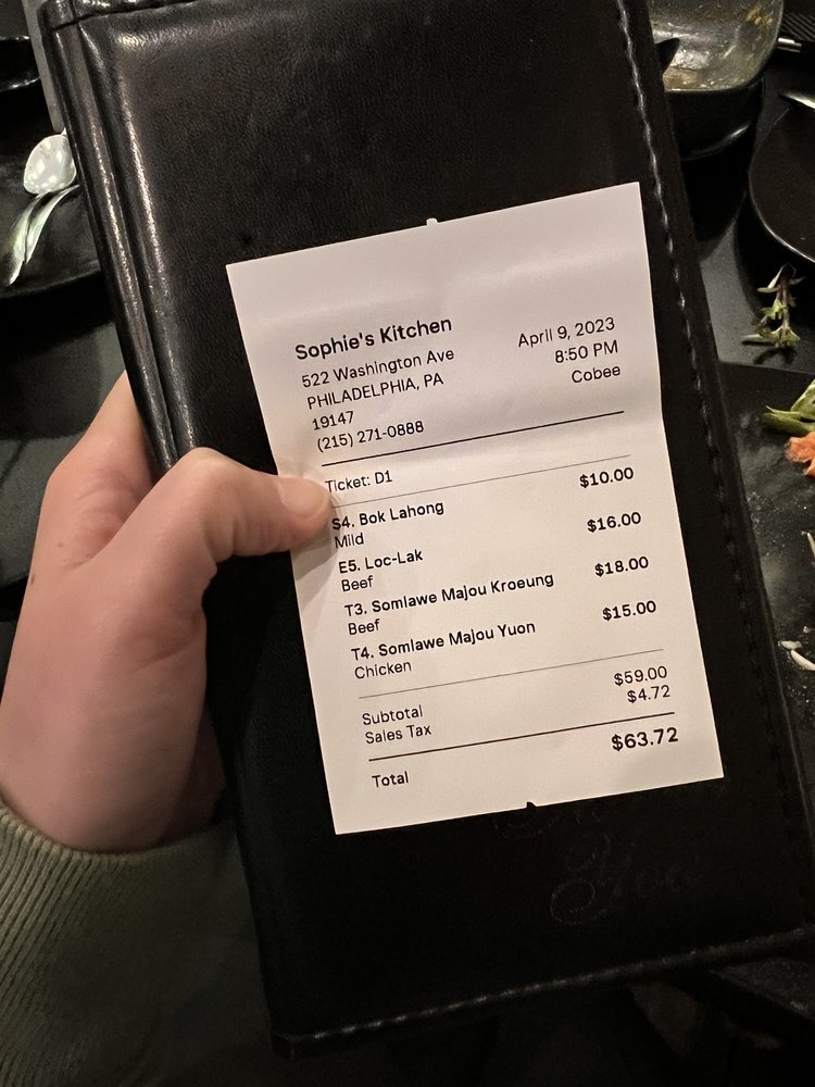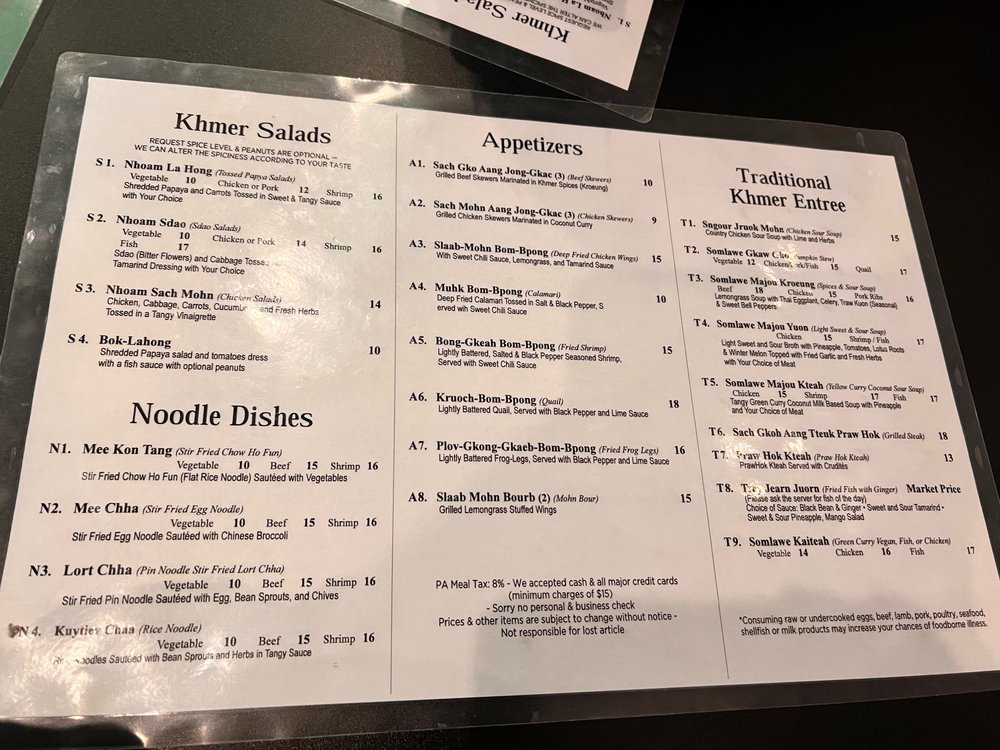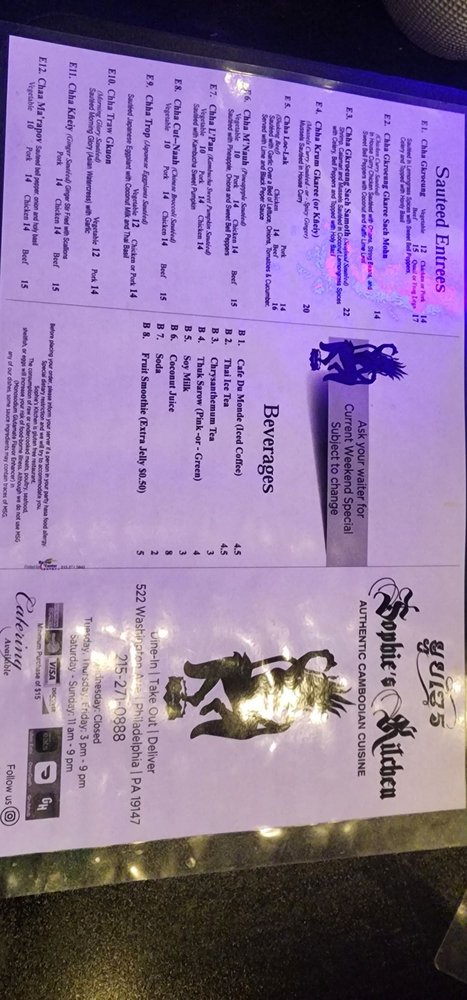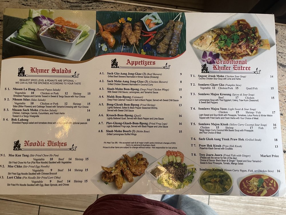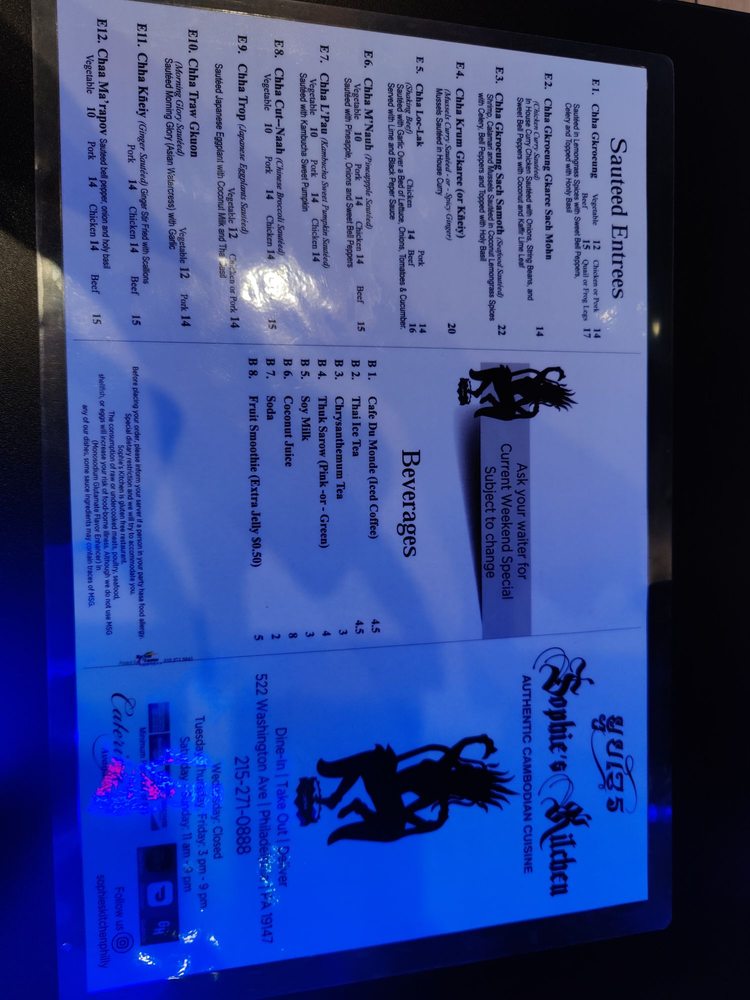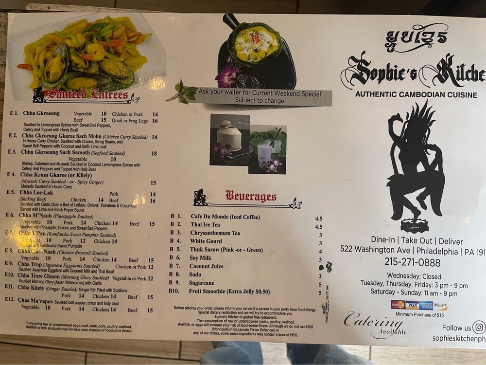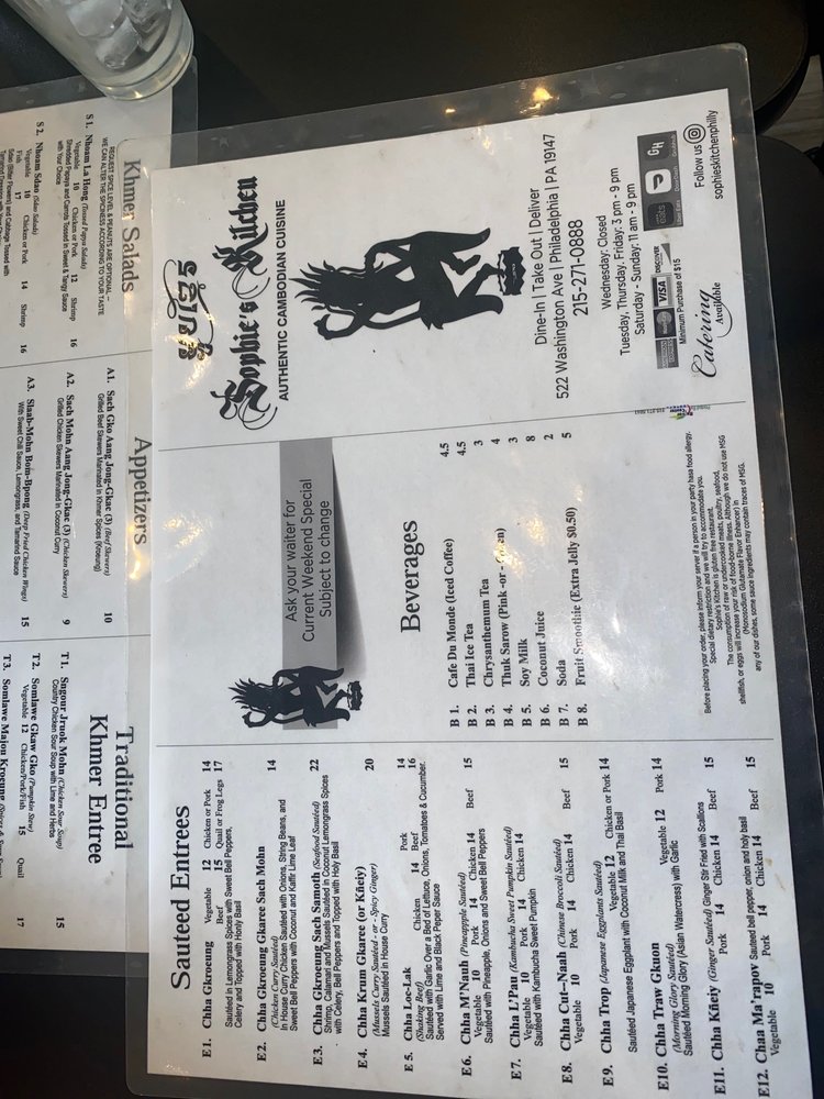 Sophie's Kitchen, located on 522 Washington Ave in Philadelphia, offers a wide range of delicious Cambodian dishes with a focus on traditional Khmer flavors. The menu features appetizers like Beef Sticks, Calamari Muhk bomb, Chicken Skewers, and more. The Khmer Salads section includes Chicken Salad, Grilled Beef Salad, Papaya Salad, and Sdao Salad. For traditional Khmer entrees, they offer Chicken Sour Soup, Grilled Steak, Praw Hok Kteah, Pumpkin Stew, Red Snapper, and various types of sour soups. The restaurant provides a casual dining experience with options for vegan and vegetarian dishes as well as catering services. Sophie's Kitchen is wheelchair accessible, offers delivery, takeout, and waitstaff service. Overall, Sophie's Kitchen is a must-visit for those looking to explore authentic Cambodian cuisine in Philadelphia.